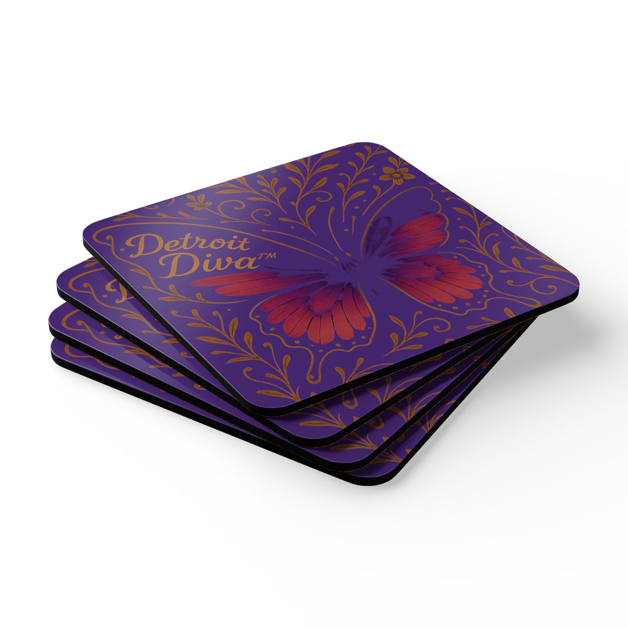 Cork coaster product features - Glossy finish for an elegant look and easy cleaning - Vibrant colors created with advanced printing techniques - High-gloss MDF top reflects light beautifully - Cork back ensures stability and prevents slipping - Set of four coasters, each 3.75" square, ideal for all drinks